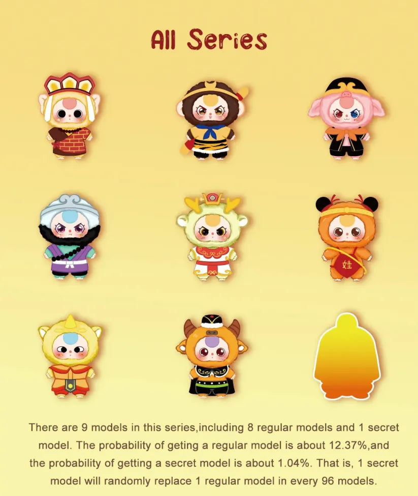 There are 9 models in this series,including 8 regular models and 1 secret model. The probability of geting a regular model is about 12.37%,and the probability of getting a secret model is about 1.04%. That is, 1 secret model will randomly replace 1 regular model in every 96 models.
